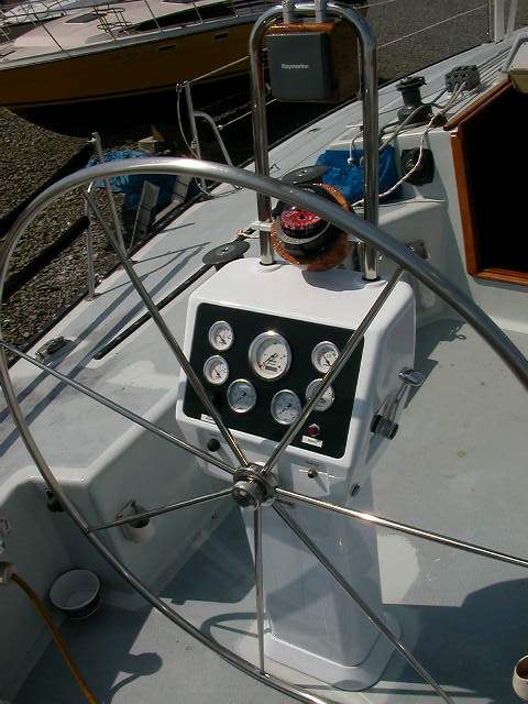 As well, there's a fish finder, GPS, Tack-tick wind display, compass and Raymarine tiller pilot above the gauges.